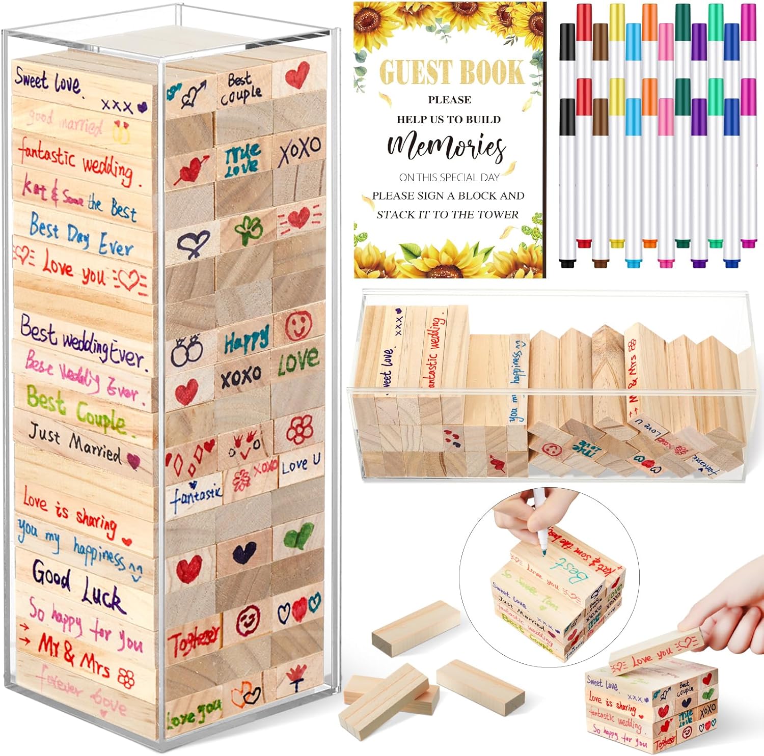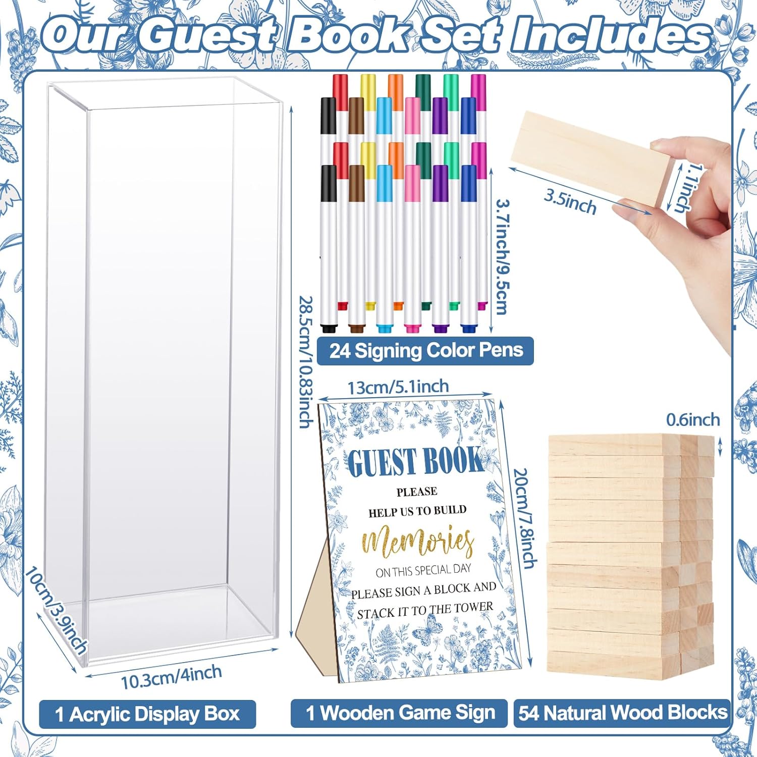 Features: Guest book pens come in 12 different colors, giving you smooth and bright lines for better decorative wood blocks. Guest book alternative for wedding reception is designed to be delicate and fun for guests, adding an extra touch of charm to the party. Specifications: Main material: wood Color: as picture shown Size: Acrylic box: about 3.94 x 3.94 x 11.02 inch/ 10 x 10 x 28 cm (outer), 3.74 x 3.74 x 10.83 inch/ 9.5 x 9.5 x 27.5 cm (inner) Wooden sign: about 5.12 x 7.87 x 0.2 inch/ 13 x 20 x 0.5 cm Wooden block: about 3.5 x 1.1 x 0.6 inch/ 8.89 x 3 x 1.5 cm Package includes: 1 x Acrylic box 54 x Wooden block 24 x Pens 1 x Wooden sign Notes: Manual measurement, please allow slight errors on size. The color may exist a slight difference due to different screen displays.